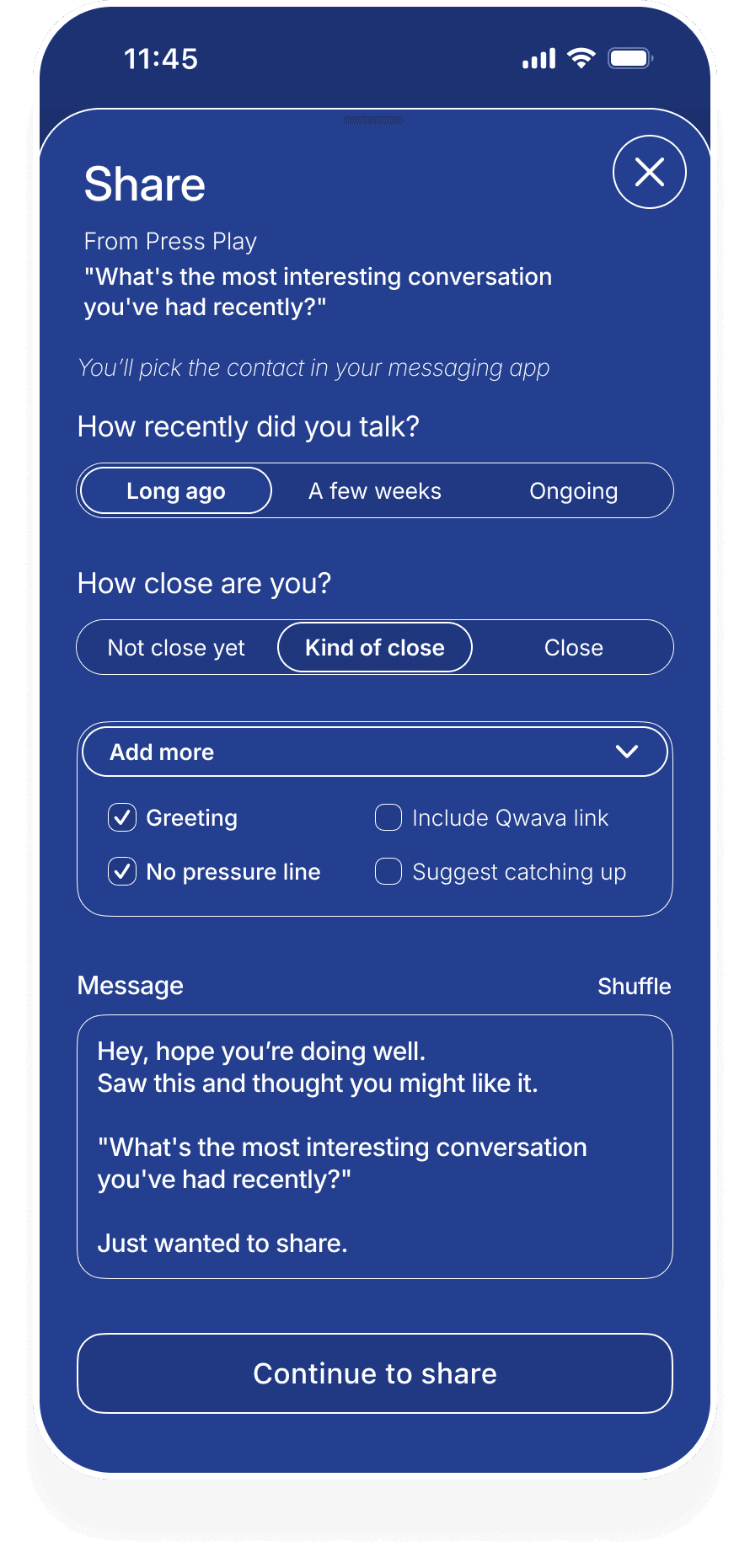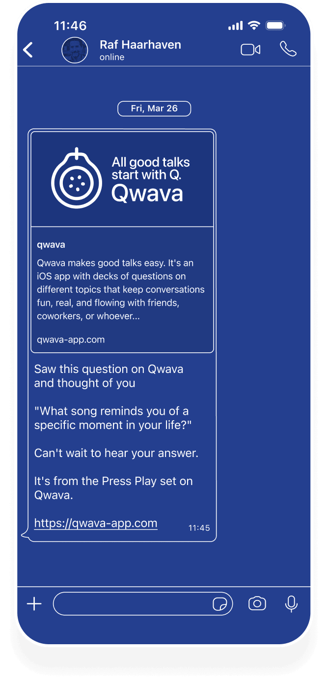 When you tap share, Qwava can suggest a short introduction that matches the moment. You choose the tone, adjust if needed, and decide whether to include the app. The goal is simple: remove hesitation and help you send something that feels like you.