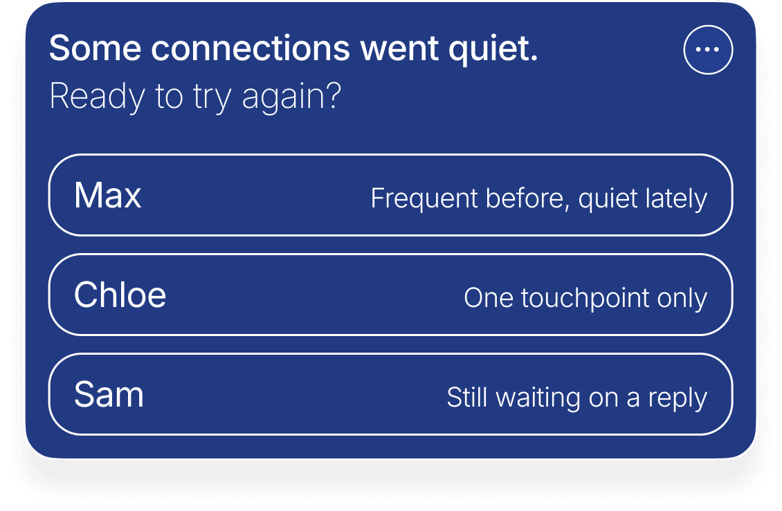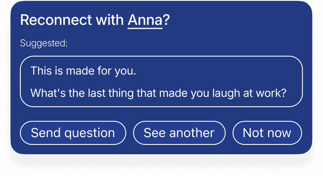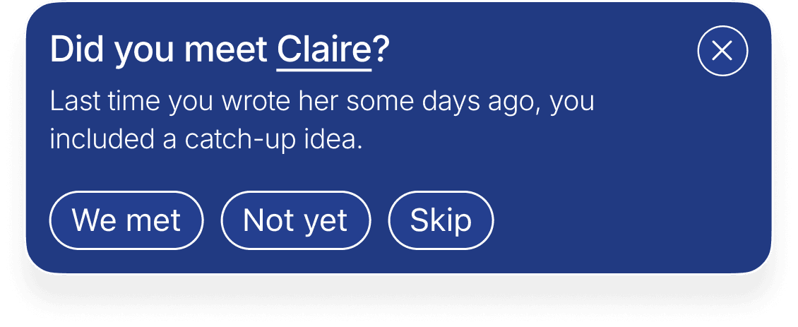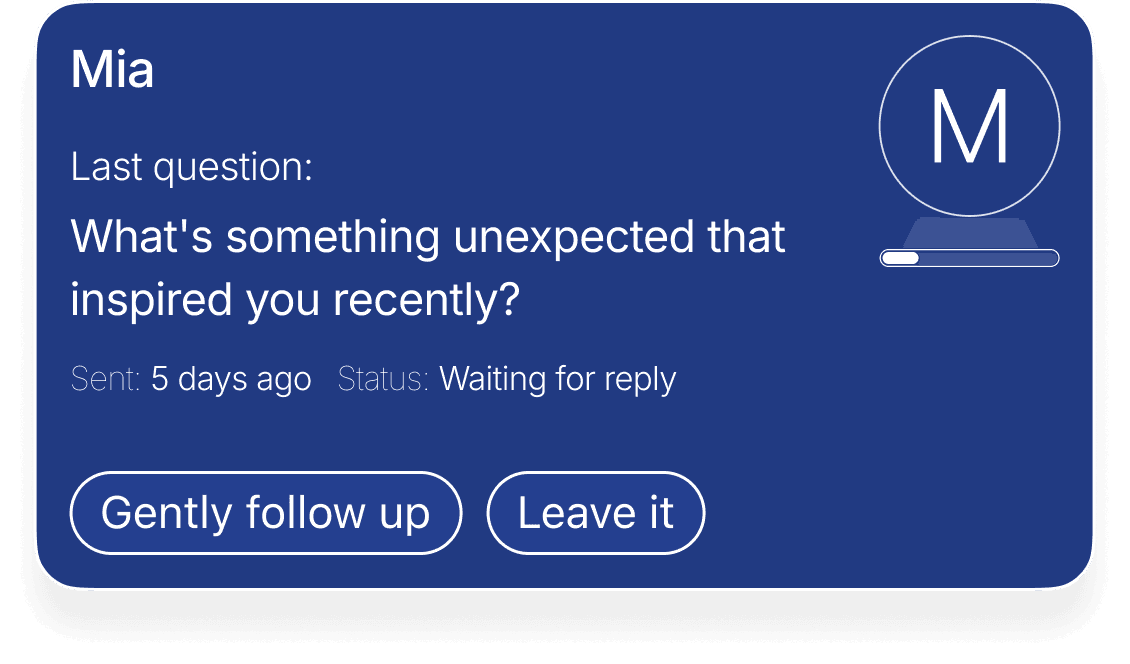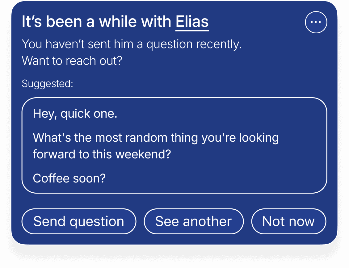 Qwava helps you notice when it has been a while and suggests a thoughtful next step. The rhythm adjusts based on closeness, past exchanges, and your preferences. Reminders stay gentle and optional, always supporting connection without turning it into a task.